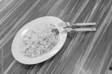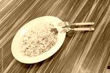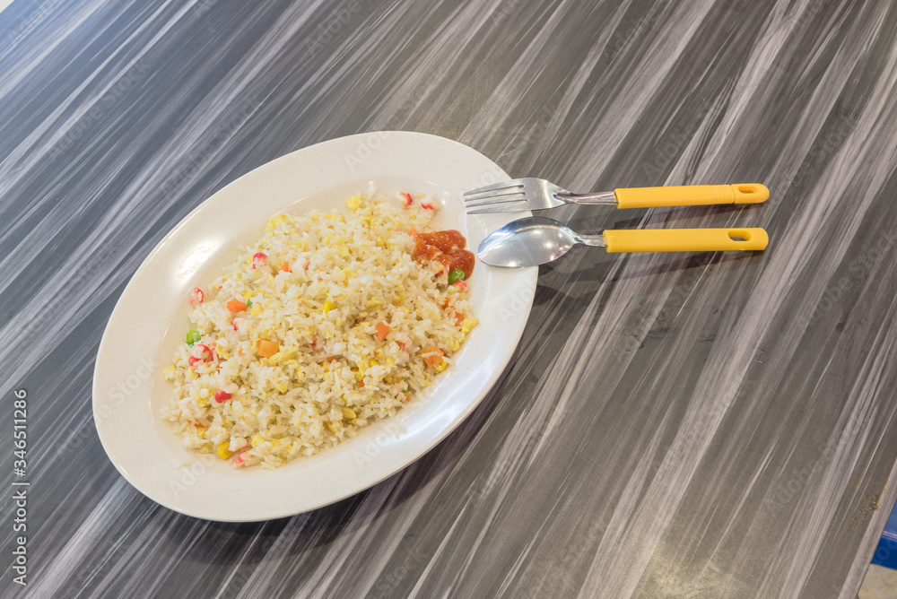 Top view a tasty fried rice plate with spoon and folk on laminate sheet table at hawker center in Singapore