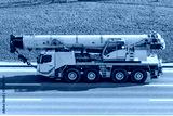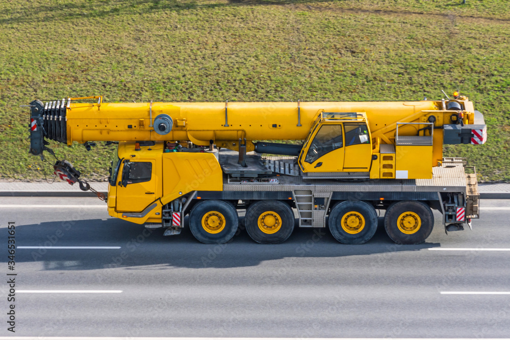 Heavy mobile crane with folding boom construction rides on a city highway, side aerial view.