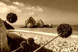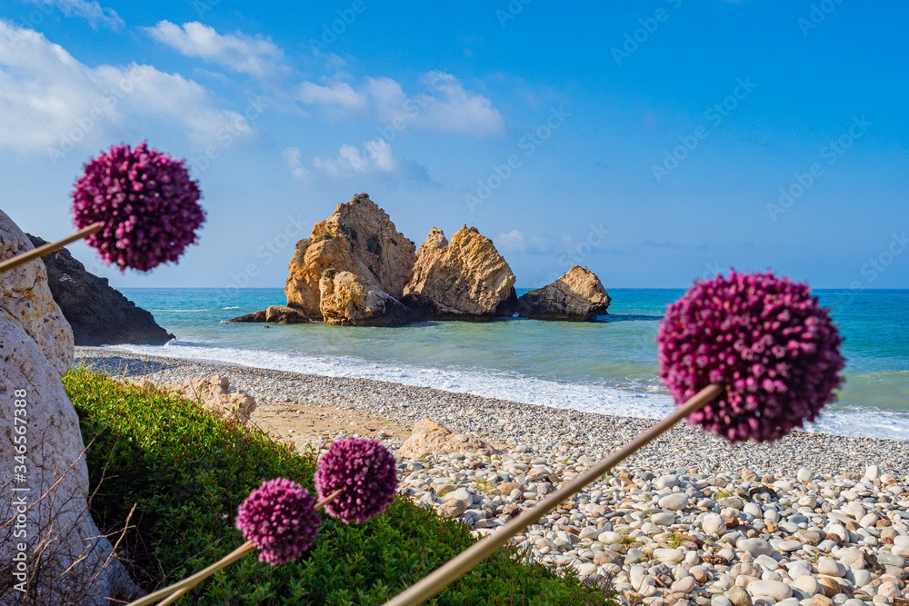 Landscape of the coast of Cyprus. Aphrodite stone on a background of pink flowers. Natural attractions of Cyprus. Petra tou Romiou. Kuklia. Pathos. The natural landscape of the Mediterranean.