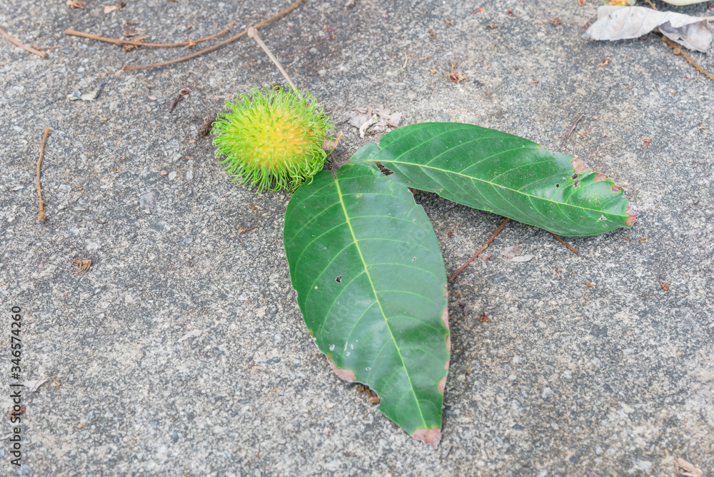 Large rambutan (or nephelium lappaceum) leaves with green fruit on concrete floor near tropical garden in Singapore