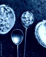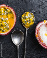 Slised passion fruit with silver spoons on black concrete background. Food photography