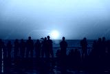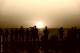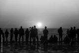 Silhouettes of people against the setting sun on deck of a cruise ship. Calm ocean and clear orange sky in evening time. Cruise vacations background