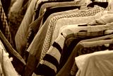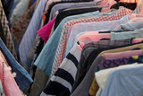 Huge selection of different used clothes for men, women and children on the rack in a second hand shop or thrift store. Concept of waste problem in fashion industry.