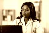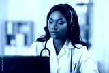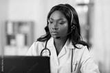 medicine, online service and healthcare concept - african american female doctor or nurse with headset and laptop having conference or video call at hospital