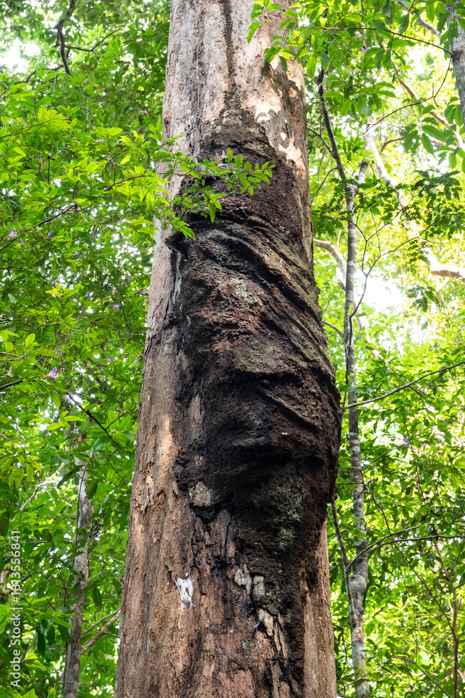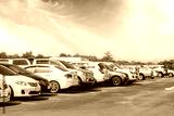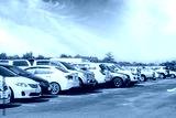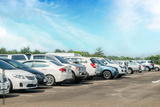 Car parked in large asphalt parking lot with trees, white cloud, blue sky background.