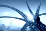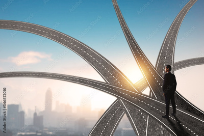 successful business way, how to success and be achievement and focus to goal concept, confident young businessman standing, looking out to develop working life to leader, walking on road to decision