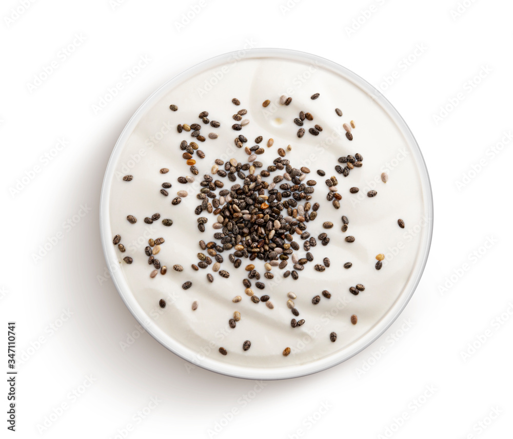 Yogurt with chia seeds isolated on white background, top view