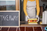 Young woman preparing takeaway healthy food inside restaurant during Coronavirus outbreak time - Worker inside kitchen cooking vegan food for online service - Focus on salad