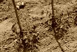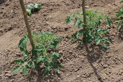 Jeune plant de tomate dans le jardin potager, avec tuteur en bois