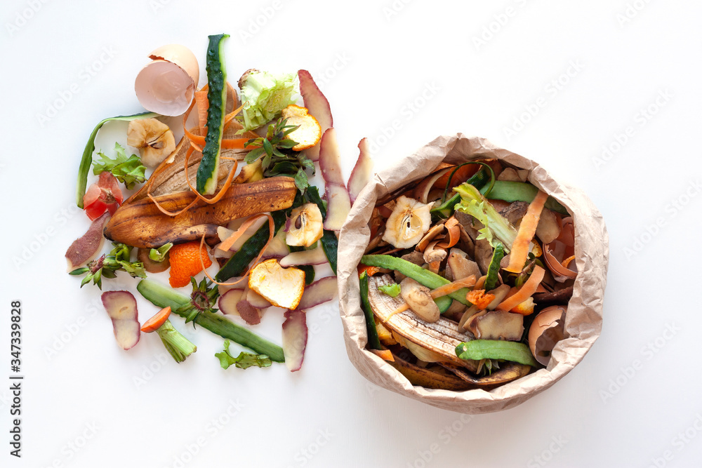 Organic food waste in paper bag and on white table. Vegetable peelings and food leftovers ready to compost. Environmentally responsible behavior, ecological, recycling waste concept. Copy space.