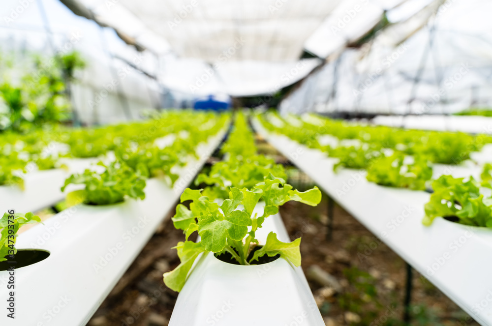 Hydroponics vegetables Green oak lettuce growing in plastic pipes at Smart farms with hydroponics systems are modern farming for healthy and quality in smart agricultural and smart farming concepts.