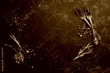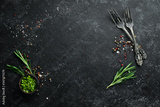 Black cooking background. Rosemary and spices on a black stone table. Top view. Free space for your text.