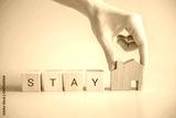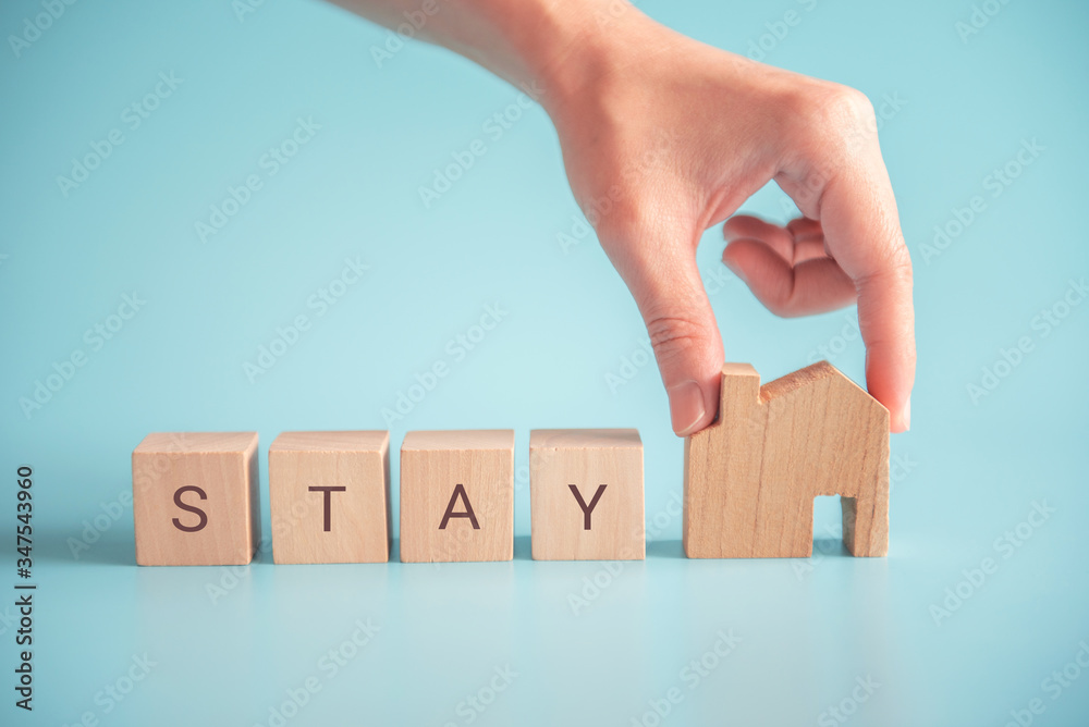 Woman hand holding wood cube with word stay home.