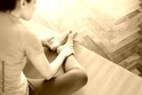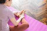 Young woman in sportswear sitting on youga mat in living room and doing butterfly stretch