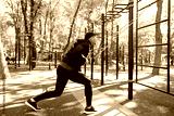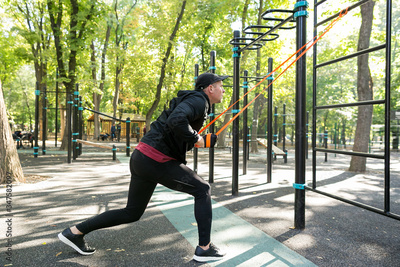 Man working out with elastic band on sports ground