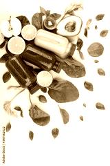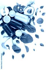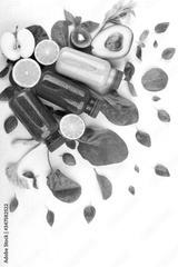 Vegetables, fruits and green detox mixtures in disposable bottles set against a white background.