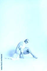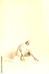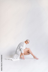 Sensual woman in white cape stretching leg