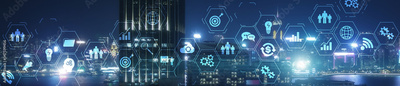 ERP Enterprise Resource Planning system on virtual screen with connections between business intelligence.