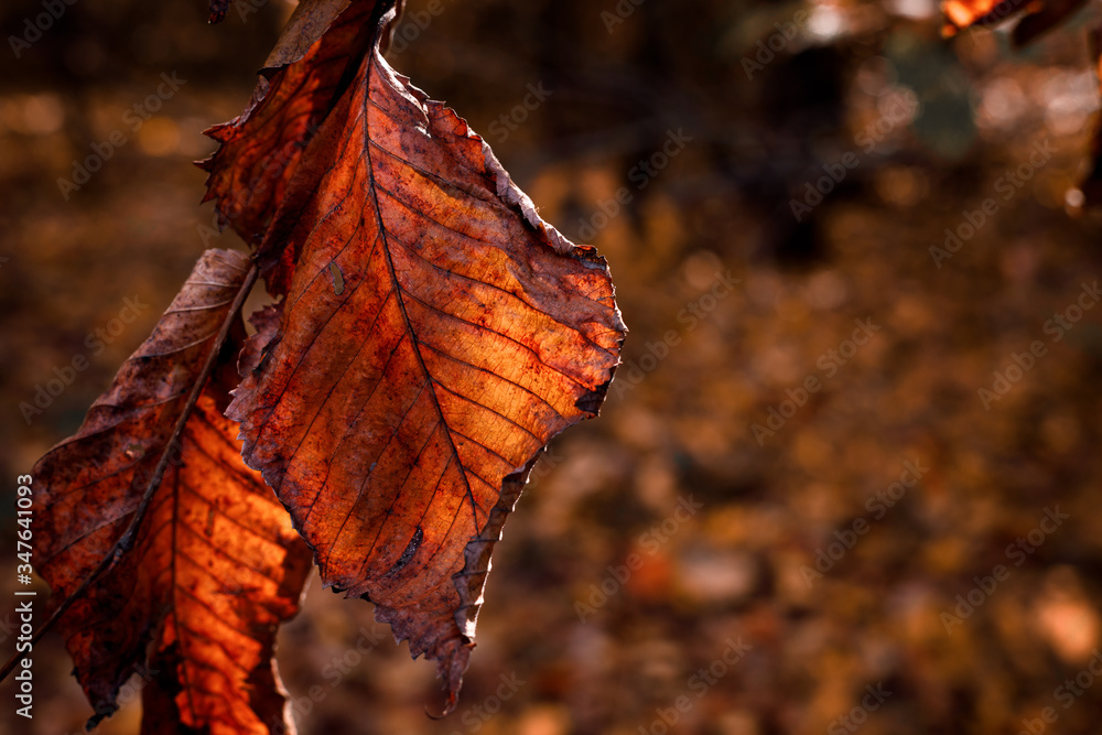 Two dry alder leaves on a branch in sunset light. Beautiful blurred autumn background. A symbol of aging, old age, the end of life