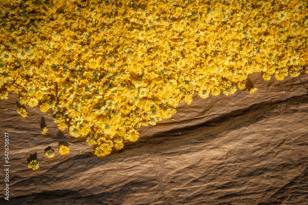 High angle view of dry Chrysanthemum flowers leaves during sunbathing process. Chrysanthemum flowers is the ingredient for making Chrysanthemum herbal tea popular in Chinese traditional.