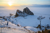 Evening view of Shaman rock one of sacred place in frozen lake Baikal in winter season of Siberia, Russia. This rock is a subject of many popular legends and myths about Baikal Lake and Angara river.