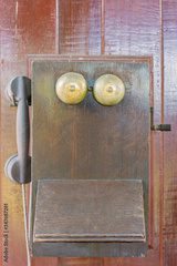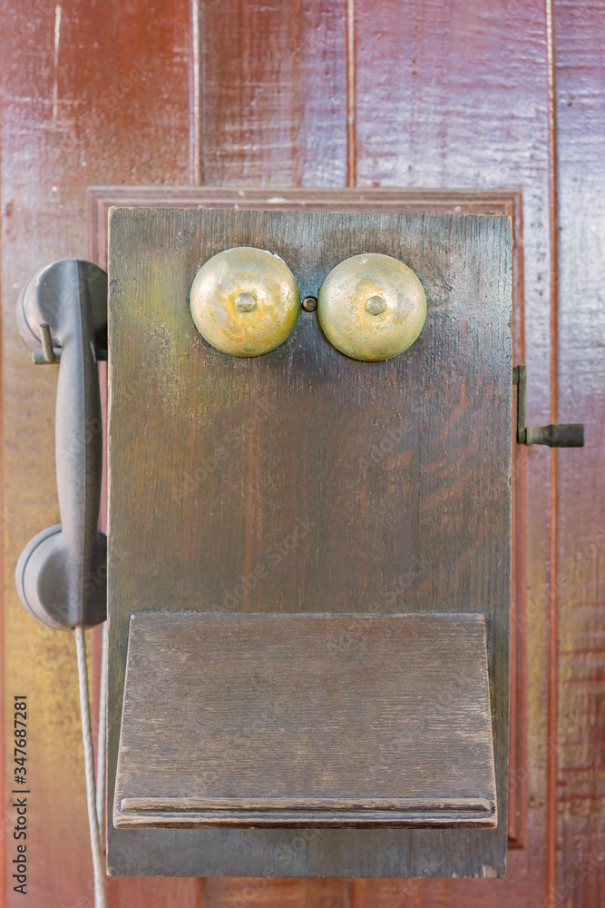 old telephone hanging on wooden wall, classic telephone or vintage wood telephone