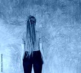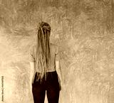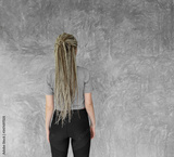 Back view of female person in gray tshirt on gray wall background
