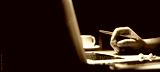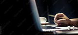 man using laptop or computer working at home in the at night and have glass coffee, book on table. for web banner with copy space.
