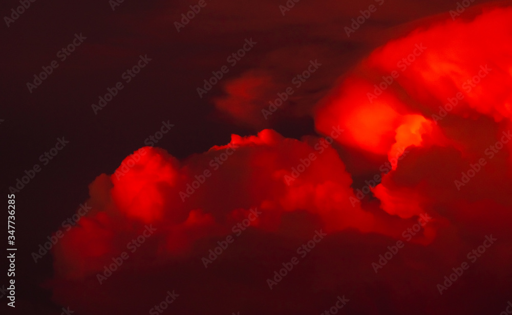 Red clouds with dark sunset sky. Red bloody clouds on dark sky. Evening twilight sky. Nature background for summer season. Dramatic red sky. Hell or heaven background. Beauty and magic in nature.