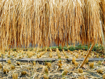Rice Harvest rice grain hanging outdoor Paddy field Asia Agriculture