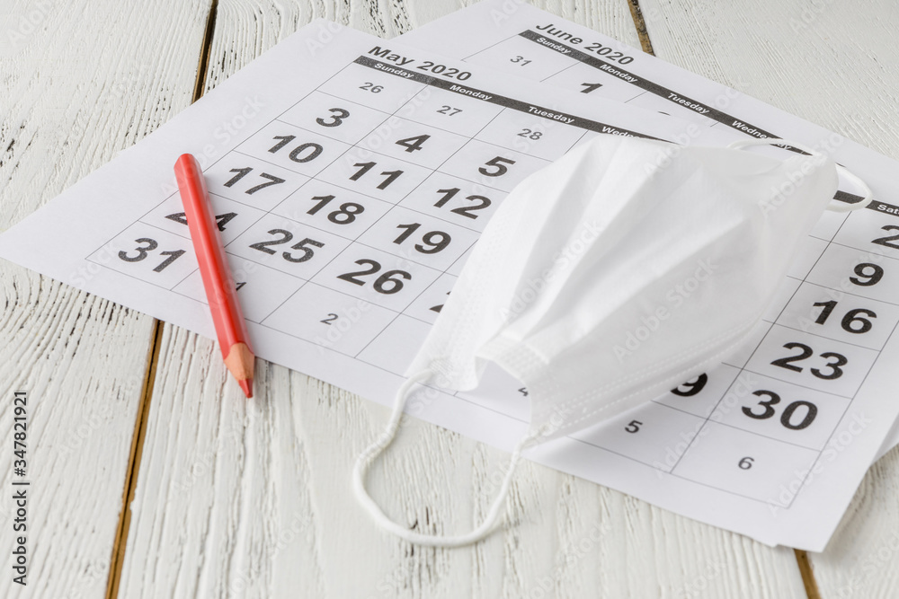 Simple desk calendar for 2020 with self protection face mask. coronavirus concept. Deadline concept with sheet of monthly calendar. Coronavirus COVID-19.