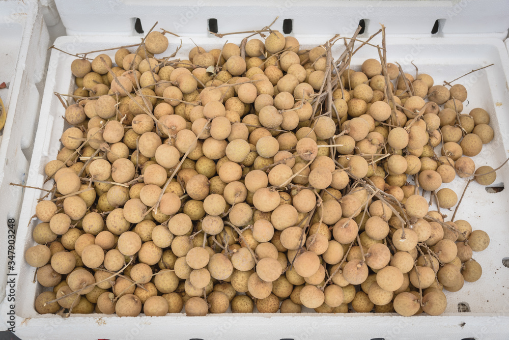 Group of fresh picked longan tropical fuirt in Styrofoam box at market stand in Little India, Singapore