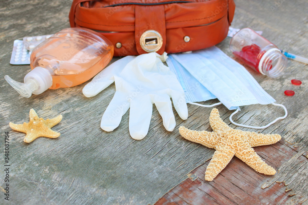 First aid kit on old wooden background. Concept of protect yourself from COVID-2019 in journey.