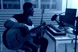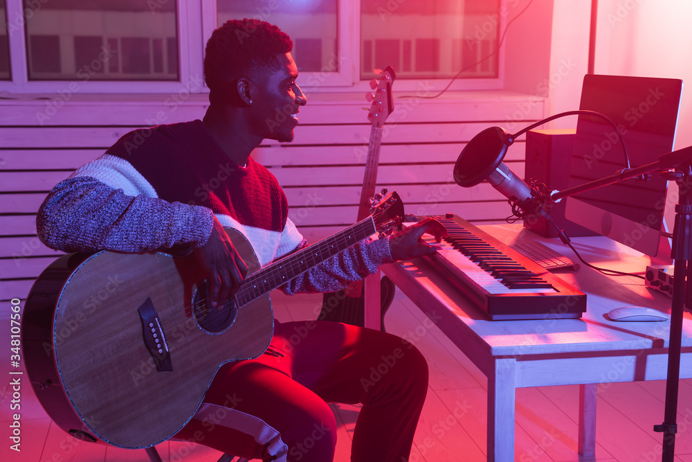 Musician and making music concept - African american male sound producer working in recording studio.