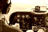 Close up of a man in a cockpit piloting small four seat airplane with hills and meadows in a distance