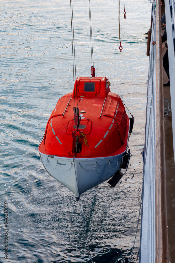 Lowering orange lifeboat to water in Arctic waters, Svalbard. Abandon ship drill. Lifeboat training. Man over board drill.