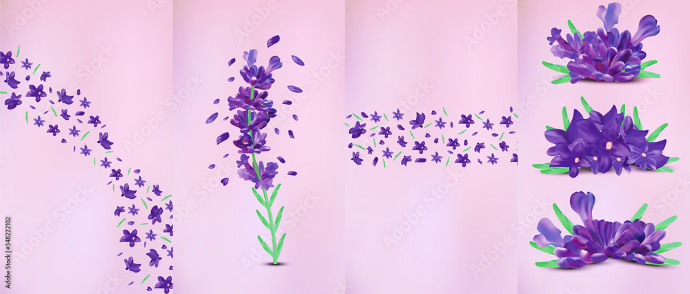 Realistic flowers lavender with green leaf. Fragrant lavender on violet background. Beautiful lavender closeup. Violet lavender in motion.Top view. 3d illustration