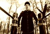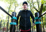 Focused sportsman exercising on parallel bars. From below of man in black sportswear