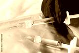 Gloved hand holding a syringe with cosmetic injection on a grey background. Plastic and aesthetic surgery.
