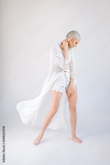 Woman in white outfit and with shaved head