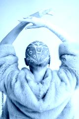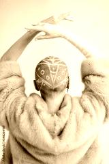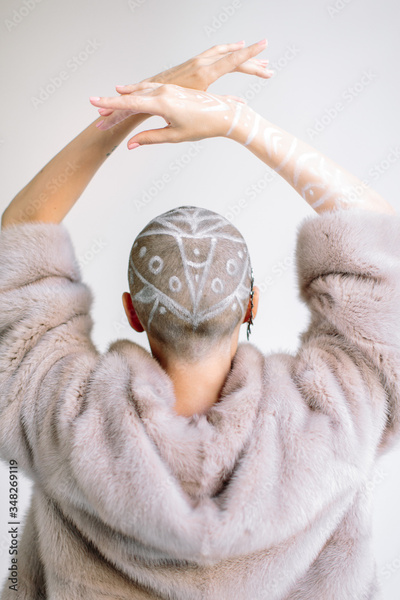 Woman with shaved head and in fur dancing