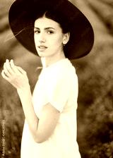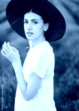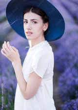 Verticled frame. Portrait of a beautiful lady in a white dress and a blue hat, which stands in the middle of lavender fields and for a moment turned around