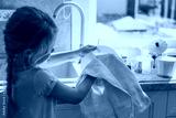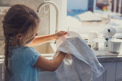 Girl cleaning kitchen, wash and dry dishes with white towel. child helps with the housework.