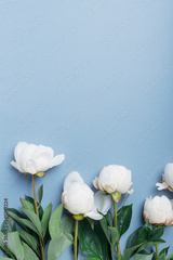 White elegant peony on the blue background. Concept of a greetings card, top view with a copy space for your text