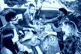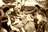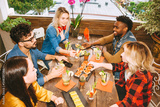 Multiracial group of young millennials friends talking and dining together - students party at rooftop cafe