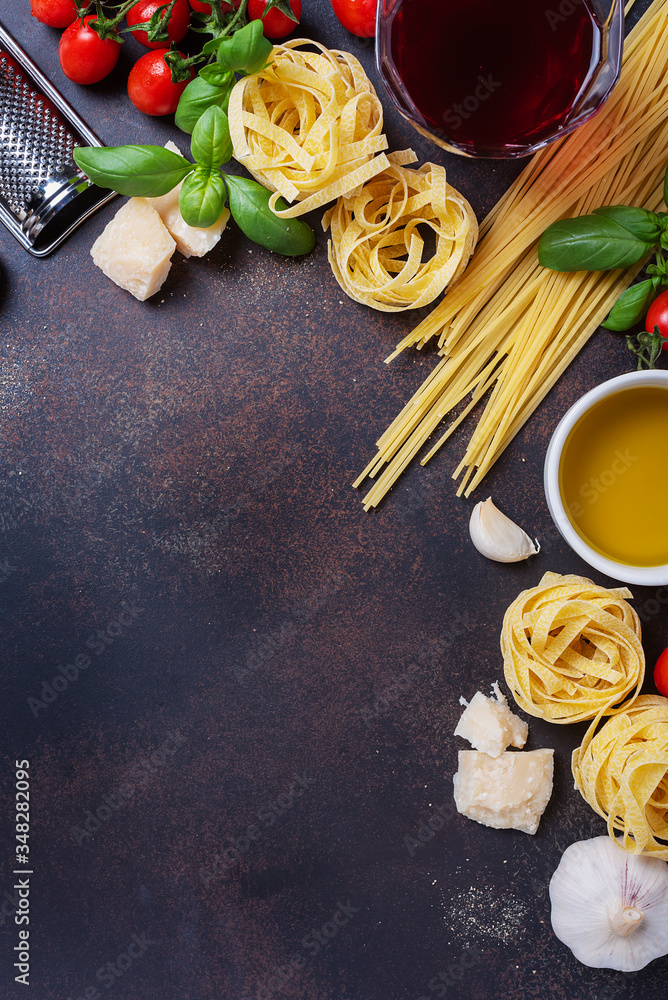 spaghetti, tagliatelle, tomato, basil, cheese, garlic and wine