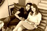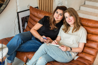 Young casual women on sofa with notepad and smartphone looking at camera.