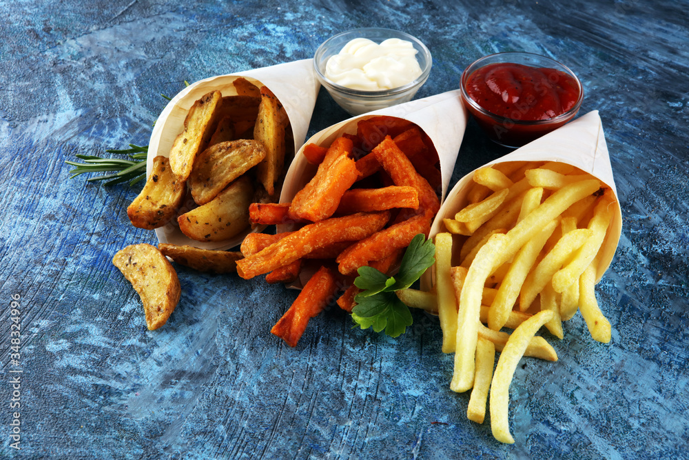 Variety of potatoes with fries. potato wedges, french fries, sweet potato for lunch on table