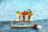 Variety of potatoes with fries. potato wedges, french fries, sweet potato for lunch on table
