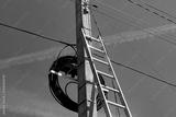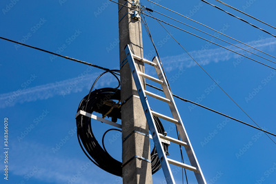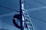A metal staircase next to a concrete electric pole with a lot of wires against the blue sky. Preparation for electrical work.